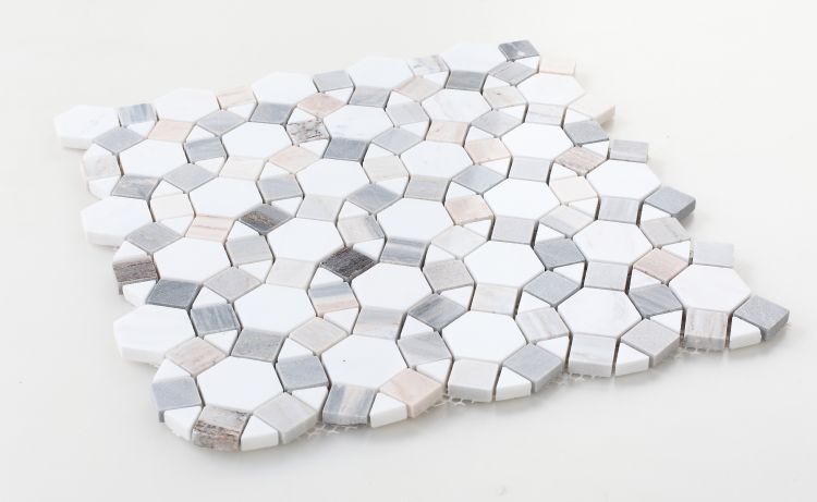 Aether Blue 11.5x12 – White Carrara mixed with Blue Palissandro marble in a circular mosaic pattern. This mosaic features a polished finish.